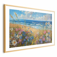 Plakat - Morski krajobraz - polne kwiaty i widok na wzburzone morze rozmiar 90x60, wykończenie Rama złota z marginesem