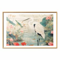 Plakat - Nad azjatyckim stawem - ilustracja w stylu japońskiej ryciny; przedstawiająca czaplę rozmiar 90x60, wykończenie Rama złota z marginesem