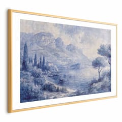 Plakat - Niebieska zatoka - włoski krajobraz jeziora Como malowany niebieskim tuszem rozmiar 30x21, wykończenie Rama złota z marginesem