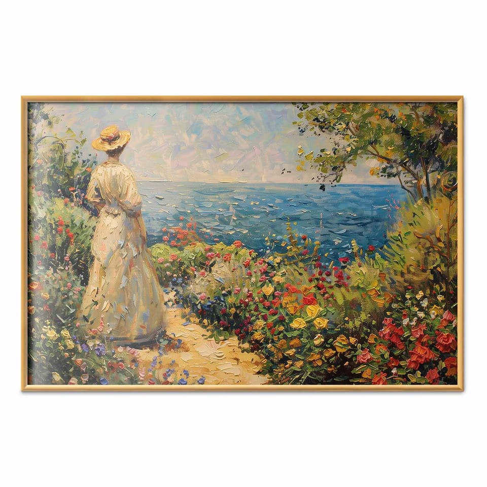 Plakat - Nostalgiczna impresja - zamyślona kobieta kontempluje krajobraz rozmiar 60x40, wykończenie Rama złota