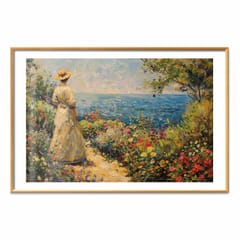 Plakat - Nostalgiczna impresja - zamyślona kobieta kontempluje krajobraz rozmiar 60x40, wykończenie Rama złota z marginesem