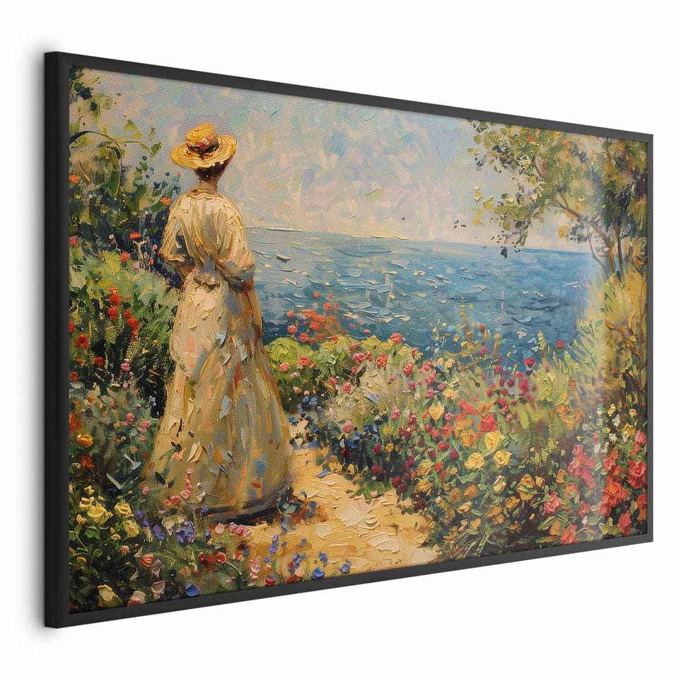 Plakat - Nostalgiczna impresja - zamyślona kobieta kontempluje krajobraz rozmiar 90x60, wykończenie Rama czarna