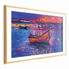 Plakat - Nowoczesny impresjonizm - nocny krajobraz jeziora z pływającą łódką rozmiar 30x21, wykończenie Rama złota z marginesem