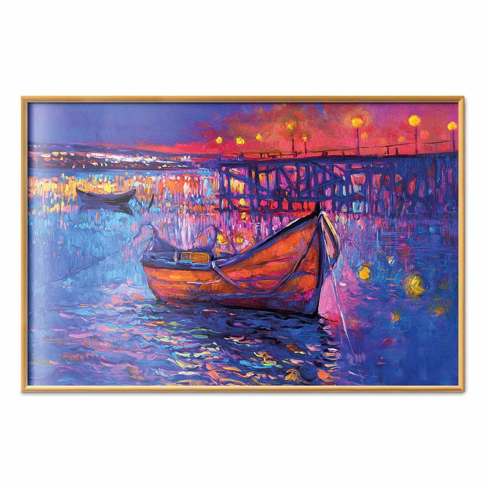Plakat - Nowoczesny impresjonizm - nocny krajobraz jeziora z pływającą łódką rozmiar 42x29.7, wykończenie Rama złota