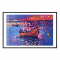 Plakat - Nowoczesny impresjonizm - nocny krajobraz jeziora z pływającą łódką rozmiar 90x60, wykończenie Rama czarna z marginesem