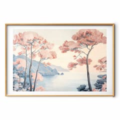 Plakat - Ocean klify i drzewa; delikatny motyw w pastelowych kolorach rozmiar 90x60, wykończenie Rama złota z marginesem