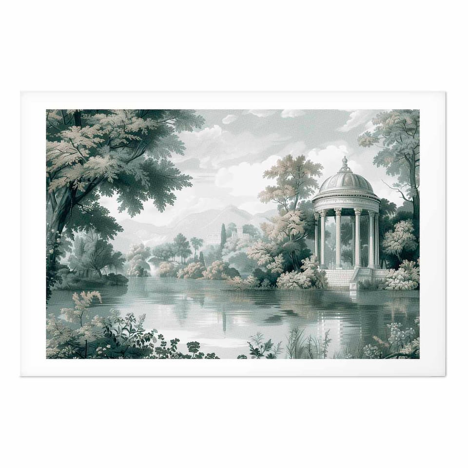 Plakat - Pejzaż z parkiem i jeziorem w retro zieleniach rozmiar 30x21, wykończenie Bez ramy z marginesem