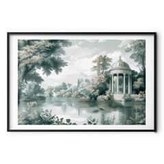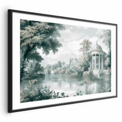 Plakat - Pejzaż z parkiem i jeziorem w retro zieleniach rozmiar 90x60, wykończenie Rama czarna z marginesem
