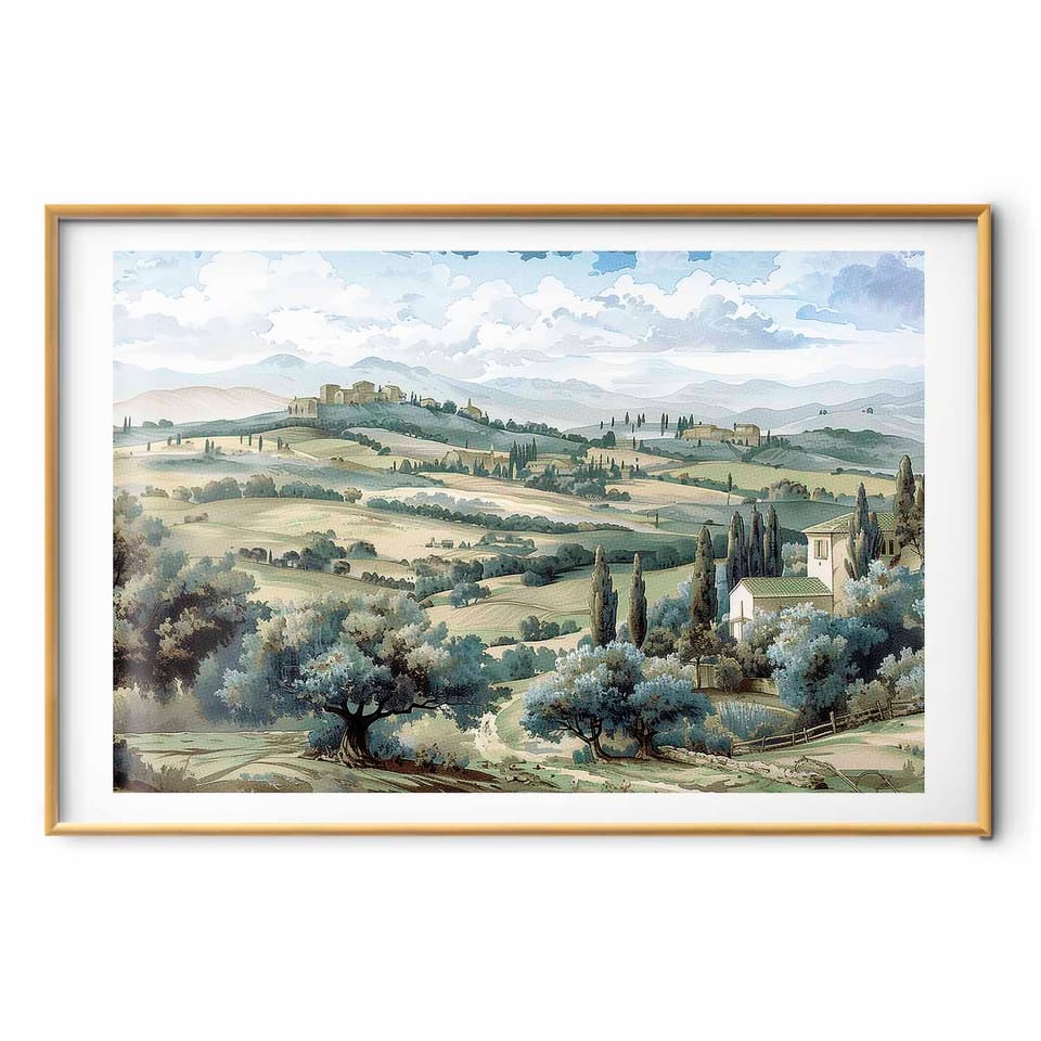 Plakat - Pejzaż ze słonecznymi; zielonymi polami rozmiar 60x40, wykończenie Rama złota z marginesem