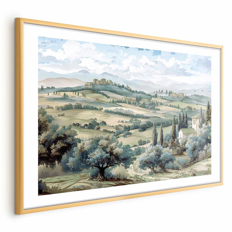 Plakat - Pejzaż ze słonecznymi; zielonymi polami rozmiar 90x60, wykończenie Rama złota z marginesem