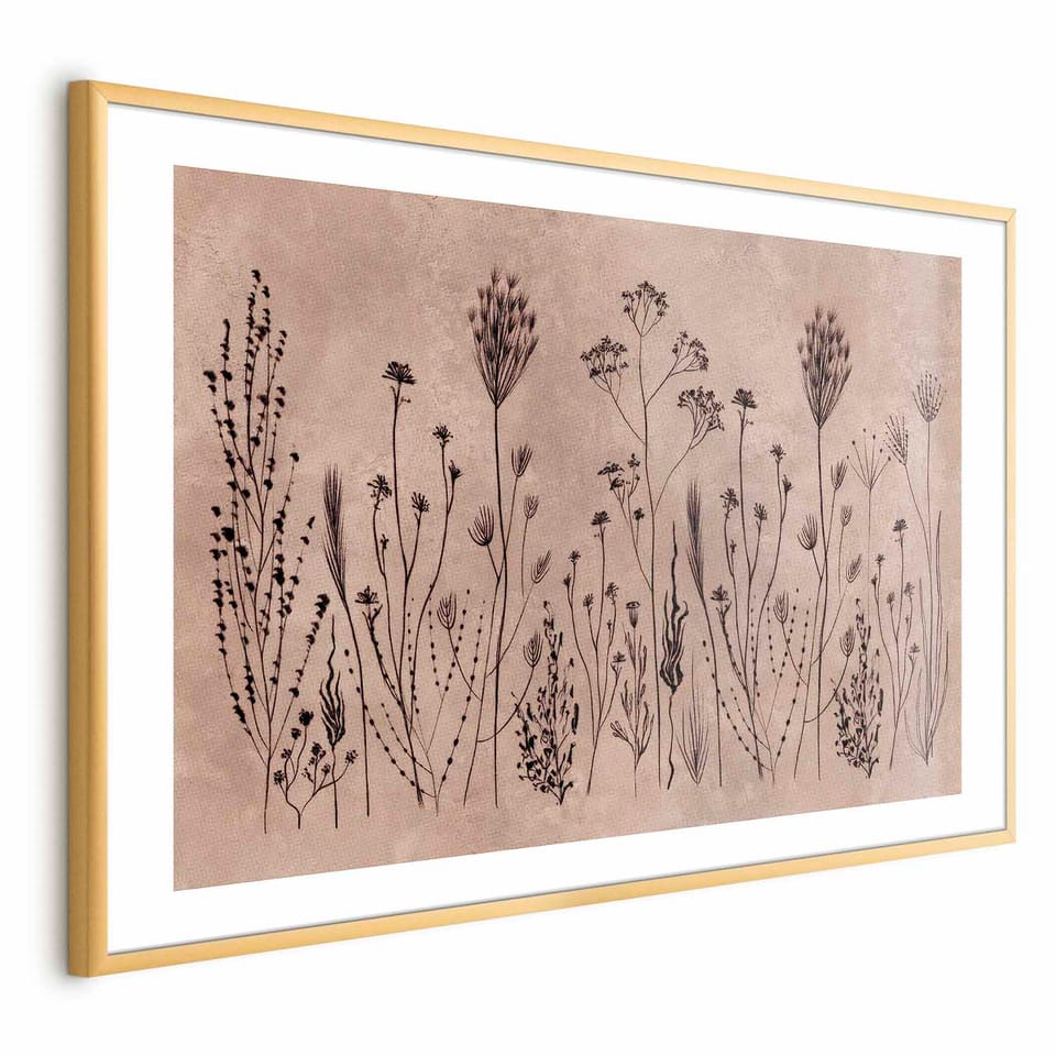 Plakat - Polne kwiaty - czarne rośliny na tle w technice lime wash rozmiar 60x40, wykończenie Rama złota z marginesem