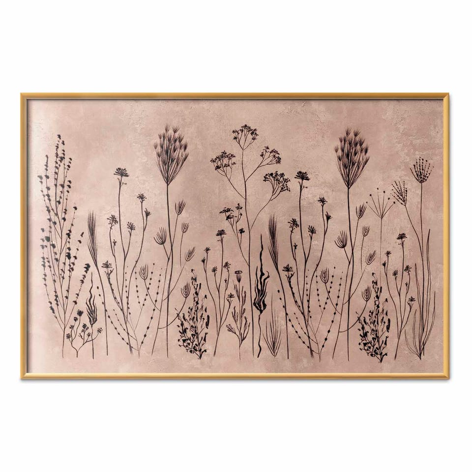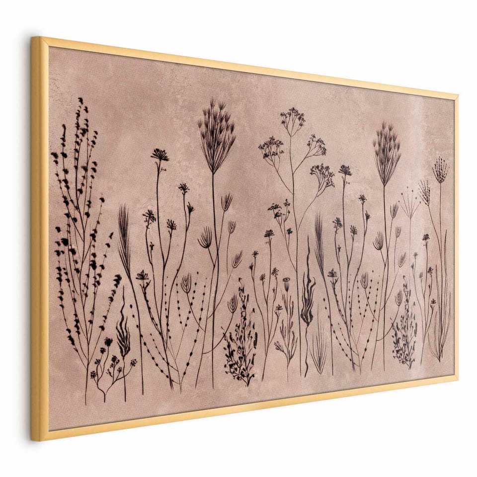 Plakat - Polne kwiaty - czarne rośliny na tle w technice lime wash rozmiar 90x60, wykończenie Rama złota