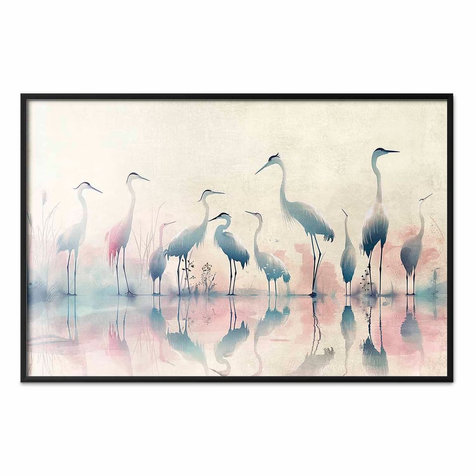 Plakat - Ptaki nad jeziorem - czaple malowane akwarelą w delikatnej; szaro-różowej kolorystyce rozmiar 60x40, wykończenie Rama czarna