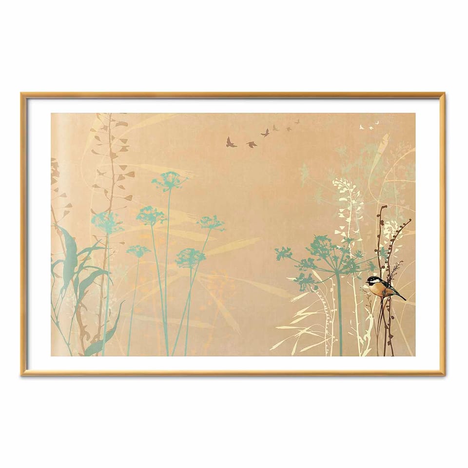 Plakat - Ptaszek na łące rozmiar 90x60, wykończenie Rama złota z marginesem