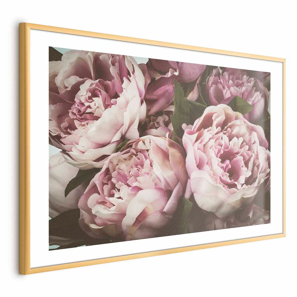 Plakat - Różowe piwonie rozmiar 60x40, wykończenie Rama złota z marginesem