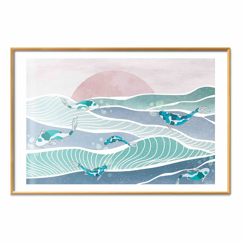 Plakat - Ryby na falach rozmiar 30x21, wykończenie Rama złota z marginesem