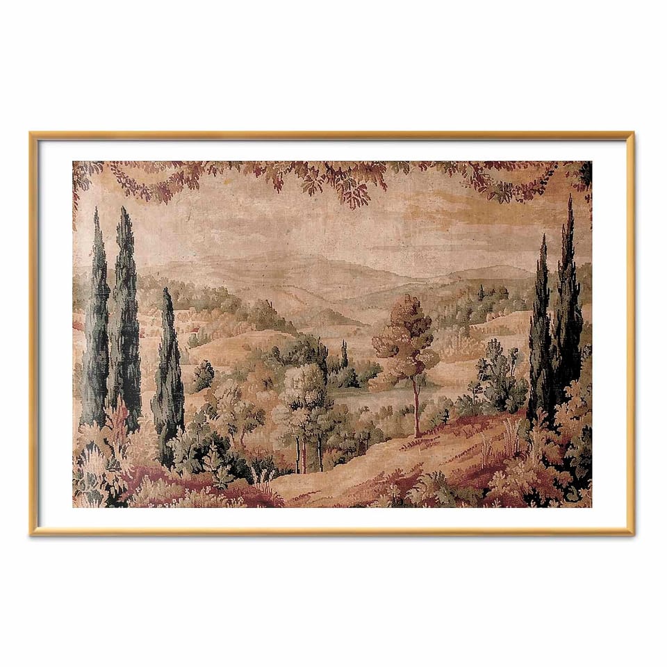 Plakat - Śródziemnomorski krajobraz - stary gobelin ze wzgórzem i jeziorem rozmiar 60x90, wykończenie Rama złota z marginesem