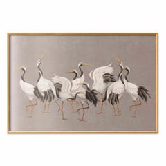 Plakat - Taniec żurawi - jasne sylwetki ptaków na ciepło-szarym tle z fakturą rozmiar 30x21, wykończenie Rama złota