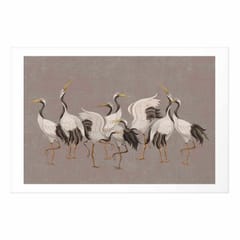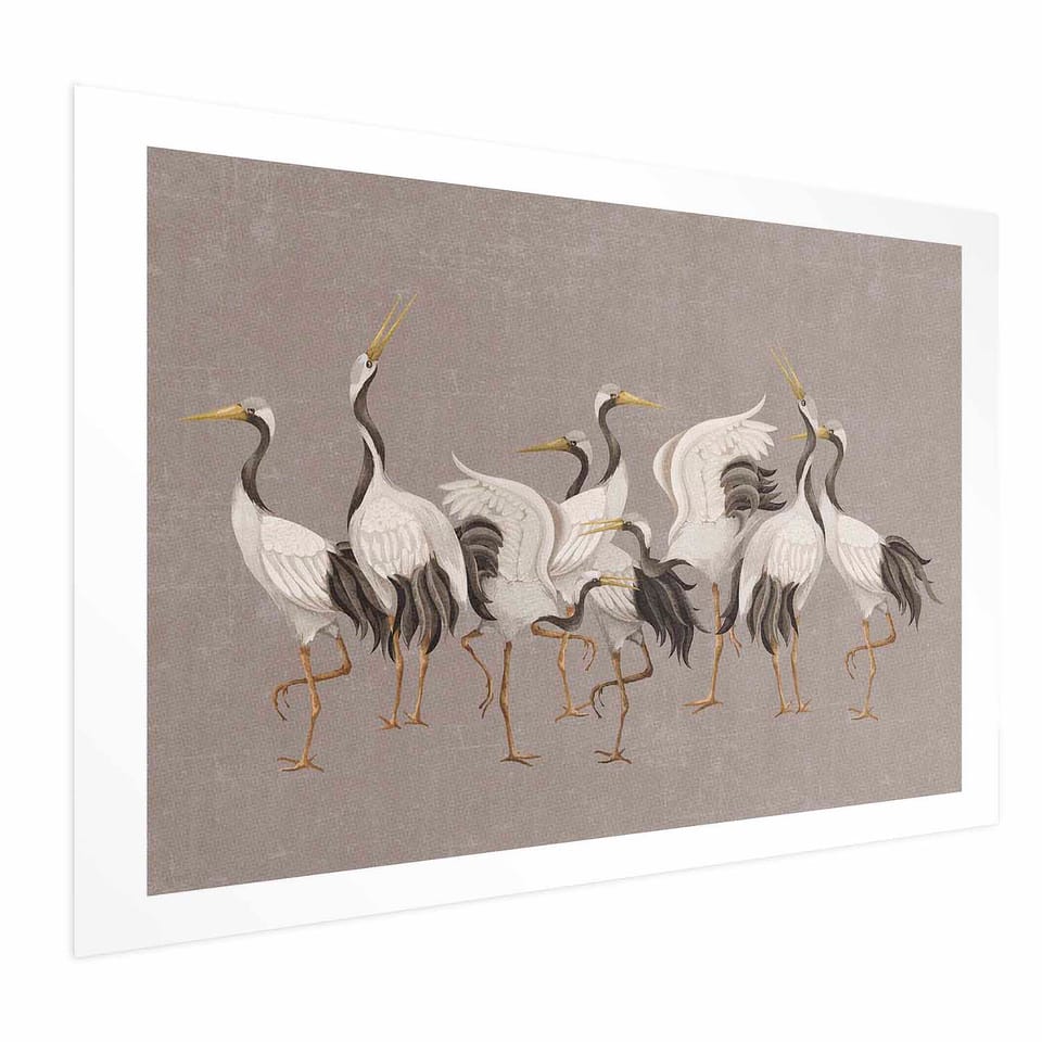 Plakat - Taniec żurawi - jasne sylwetki ptaków na ciepło-szarym tle z fakturą rozmiar 42x29.7, wykończenie Bez ramy z marginesem