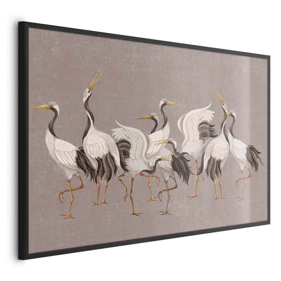 Plakat - Taniec żurawi - jasne sylwetki ptaków na ciepło-szarym tle z fakturą rozmiar 42x29.7, wykończenie Rama czarna