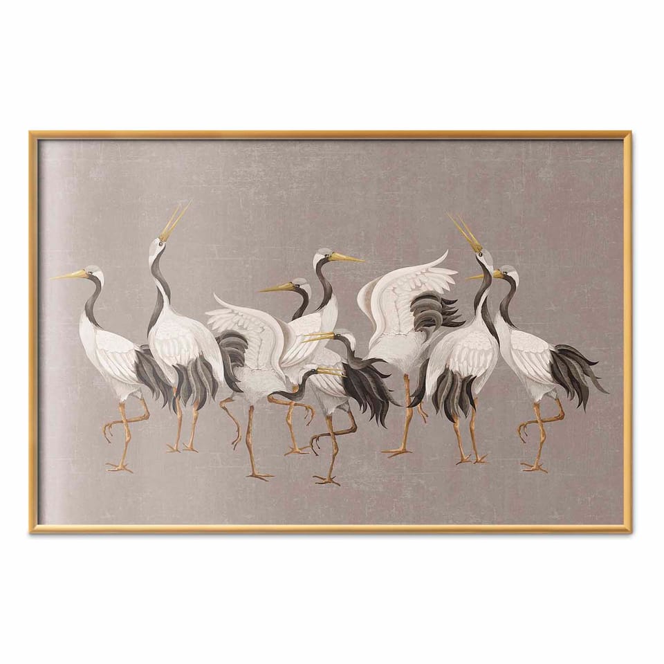 Plakat - Taniec żurawi - jasne sylwetki ptaków na ciepło-szarym tle z fakturą rozmiar 60x40, wykończenie Rama złota