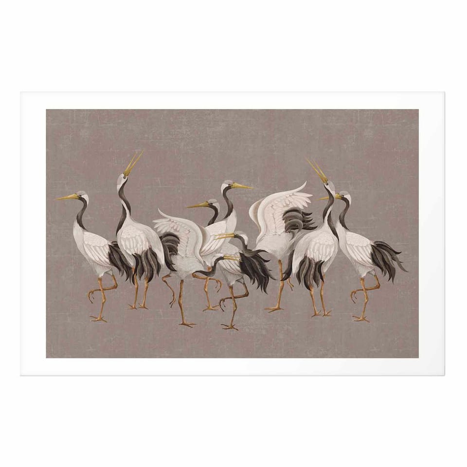 Plakat - Taniec żurawi - jasne sylwetki ptaków na ciepło-szarym tle z fakturą rozmiar 90x60, wykończenie Bez ramy z marginesem