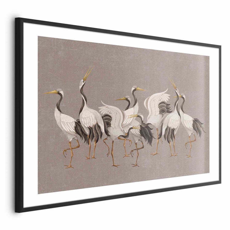 Plakat - Taniec żurawi - jasne sylwetki ptaków na ciepło-szarym tle z fakturą rozmiar 90x60, wykończenie Rama czarna z marginesem