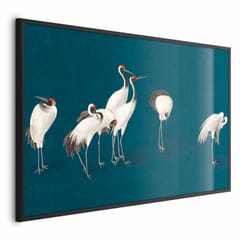 Plakat - Wieczór nad stawem - grupa żurawi narysowana suchą pastelą; na ciemno-turkusowym tle rozmiar 60x40, wykończenie Rama czarna