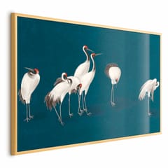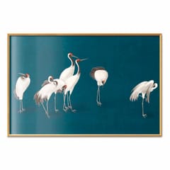 Plakat - Wieczór nad stawem - grupa żurawi narysowana suchą pastelą; na ciemno-turkusowym tle rozmiar 60x40, wykończenie Rama złota