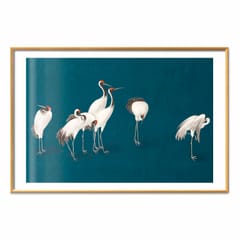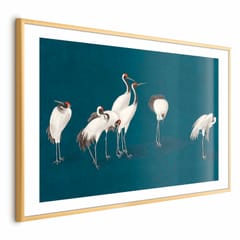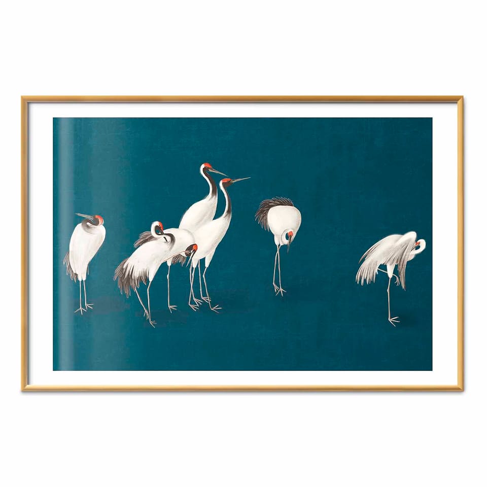 Plakat - Wieczór nad stawem - grupa żurawi narysowana suchą pastelą; na ciemno-turkusowym tle rozmiar 60x40, wykończenie Rama złota z marginesem