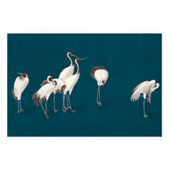 Plakat - Wieczór nad stawem - grupa żurawi narysowana suchą pastelą; na ciemno-turkusowym tle rozmiar 90x60, wykończenie Bez ramy