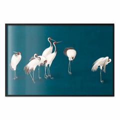 Plakat - Wieczór nad stawem - grupa żurawi narysowana suchą pastelą; na ciemno-turkusowym tle rozmiar 90x60, wykończenie Rama czarna