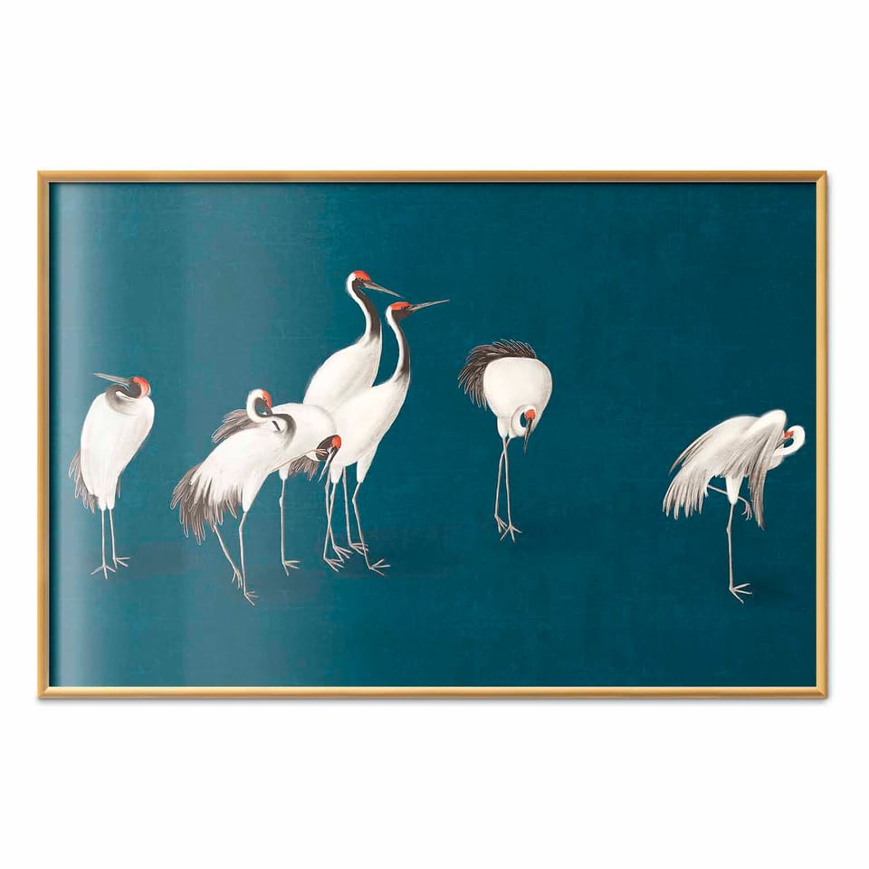 Plakat - Wieczór nad stawem - grupa żurawi narysowana suchą pastelą; na ciemno-turkusowym tle rozmiar 90x60, wykończenie Rama złota