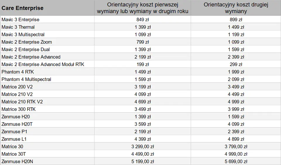 DJI Care Enterprise nie obejmuje:1) Zgubionego bądź częściowo zgubionej kamery, gimbala lub akcesoriów.2) Kradzieży lub porzucenia produktu.3) Uszkodzeń spowodowanych lotem w niewłaściwych warunkachatmosferycznych.4) Nadajnika, akcesoriów dodatkowych.5) Rozmyślnej utraty drona.6) Uszkodzeń obudowy, które nie wpływają na działanie produktu.7) Bezpośrednich lub niebezpośrednich uszkodzeń spowodowanych działaniem sił wyższych.8) Usterek powstałych poza okresem ważności DJI Care Enterprise.9) Dodatkowych opłat związanych z ulepszaniem modelu, poprawianiem jego osiągów.10) Usterek wynikających z przeprowadzania modyfikacji, które nie są zgodne z zaleceniami znajdującymi się w podręczniku użytkownika bądź z używania niekompatybilnych akumulatorów i ładowarki.11) Usterek wynikających z korzystania z nieautoryzowanych akcesoriów, akumulatorów bądź oprogramowania.