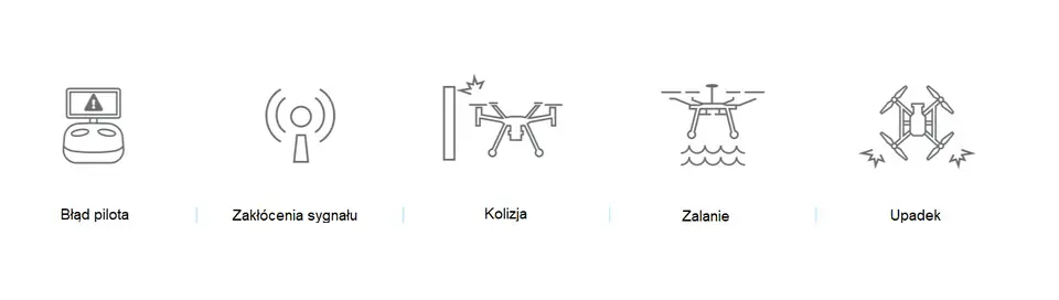 DJI Care Enterprise nie obejmuje:1) Zgubionego bądź częściowo zgubionej kamery, gimbala lub akcesoriów.2) Kradzieży lub porzucenia produktu.3) Uszkodzeń spowodowanych lotem w niewłaściwych warunkachatmosferycznych.4) Nadajnika, akcesoriów dodatkowych.5) Rozmyślnej utraty drona.6) Uszkodzeń obudowy, które nie wpływają na działanie produktu.7) Bezpośrednich lub niebezpośrednich uszkodzeń spowodowanych działaniem sił wyższych.8) Usterek powstałych poza okresem ważności DJI Care Enterprise.9) Dodatkowych opłat związanych z ulepszaniem modelu, poprawianiem jego osiągów.10) Usterek wynikających z przeprowadzania modyfikacji, które nie są zgodne z zaleceniami znajdującymi się w podręczniku użytkownika bądź z używania niekompatybilnych akumulatorów i ładowarki.11) Usterek wynikających z korzystania z nieautoryzowanych akcesoriów, akumulatorów bądź oprogramowania.