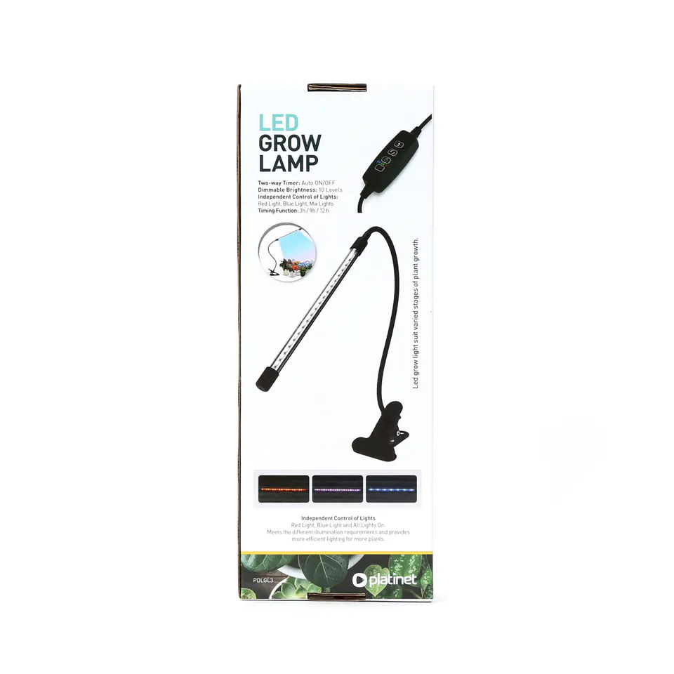 Lampa do wzrostu PDLGL3 z klipsem, regulacją koloru i natężenia światła i timerem.Niezależnie od tego, czy jesteś doświadczonym ogrodnikiem, czy dopiero zaczynasz swoją przygodę z roślinami, nasza lampka sprawi, że Twoje rośliny będą kwitły jak nigdy dotąd.Regulacja koloru i natężenia światłaNasza lampka pozwala Ci dostosować światło do potrzeb Twoich roślin. Teraz możesz zapewnić im dokładnie to, czego potrzebują w każdej fazie wzrostu!Lampa PDLGL3 rozświetli Twoje rośliny. Dzięki 24 diodom LED, zapewnia ona niesamowite 60 lumenów intensywnego światła, co oznacza, że Twoje rośliny zawsze otrzymują dokładnie tę ilość energii, której potrzebują.Dzięki 10 poziomom jasności, masz pełną kontrolę nad natężeniem światła, co pozwala dostosować oświetlenie do różnych rodzajów roślin i ich indywidualnych potrzeb.Wbudowany timerFunkcja timera pozwoli Ci zaprogramować lampę tak, by automatycznie dostosować czas naświetlania Twoich roślin. To oszczędność czasu i pewność, że Twoje rośliny otrzymają odpowiednią ilość światła.Specyfikacja technicznaTimer3 tryby oświetlenia 10 poziomów jasności AC 100-240V 5V/1A 50-60 Hz Klasa bezpieczeństwa elektrycznego Cass IIStopień ochrony IP20Temperatura światła - 1300 K Maks. 60 LmMoc znamionowa - 3W Współczynnik mocy - >0,4 CRI - 80 ra 24 diody LED Czas włączenia: Czas do osiągnięcia 60% mocy - Zakres temperatury: -20 + 35 °C Kąt rozsyłu światła - 120 °Długość przewodu: 154 cm