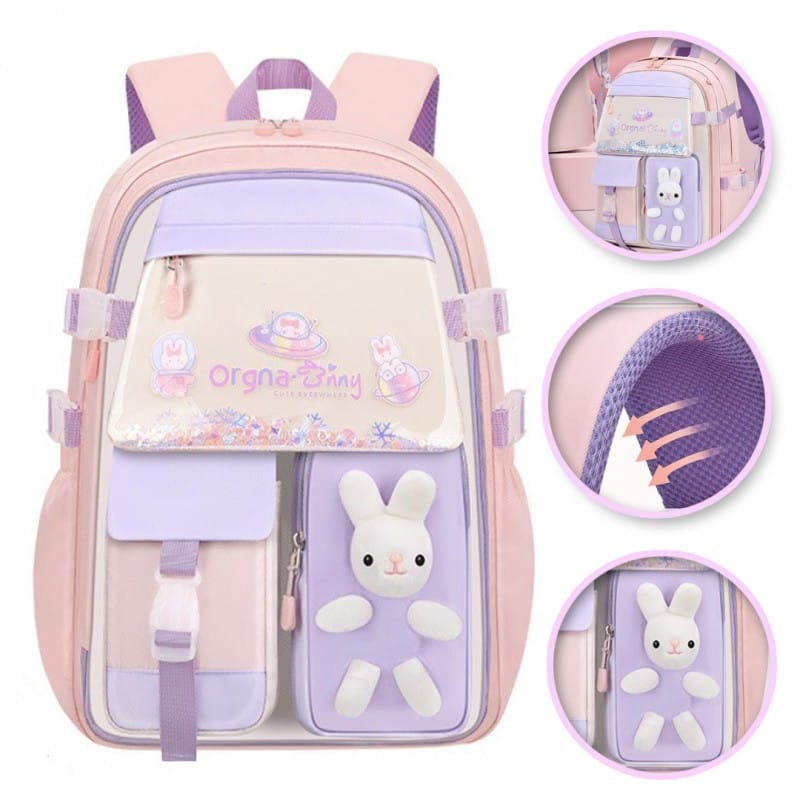 Wodoodporny dziecięcy plecak, szkolny z maskotkąJest bardzo pojemny i praktyczny. Pomieści wszystkie potrzebne rzeczy jak i sprzęt elektroniczny: komputer, piórnik, tablet, telefon etc.Duża pojemność i przestrzeń do przechowywania, plecak dla dziewcząt, może sprostać różnym potrzebom do szkoły, biura, w podróży. Specyfikacja:- Dwie główne komory pomieszczą książki o standardowych rozmiarach;- Trzy przednie kieszenie są idealne na przybory szkolne, przekąski lub inne małe przedmioty;- Dwie boczne kieszenie mogą dobrze sprawdzić się w trzymaniu butelek z wodą i składanych parasoli;- Tkanina nylonowa, trwała, wodoodporna, odporna na zużycie i rozdarcie, lekka, łatwa do czyszczenia;- Oddychający tylny panel, poszerzone i pogrubione regulowane paski zapewniają wygodę i suchość pleców;- Odblaskowe elementy plecaka zapewniają bezpieczeństwo;- Dwukierunkowe, gładkie zamki błyskawiczne;- Duża pojemność: 35 litrów Wymiary:45 x 32 x 17 cm Materiał:100 % oxfordPodszewka - 100% poliester Waga:770g