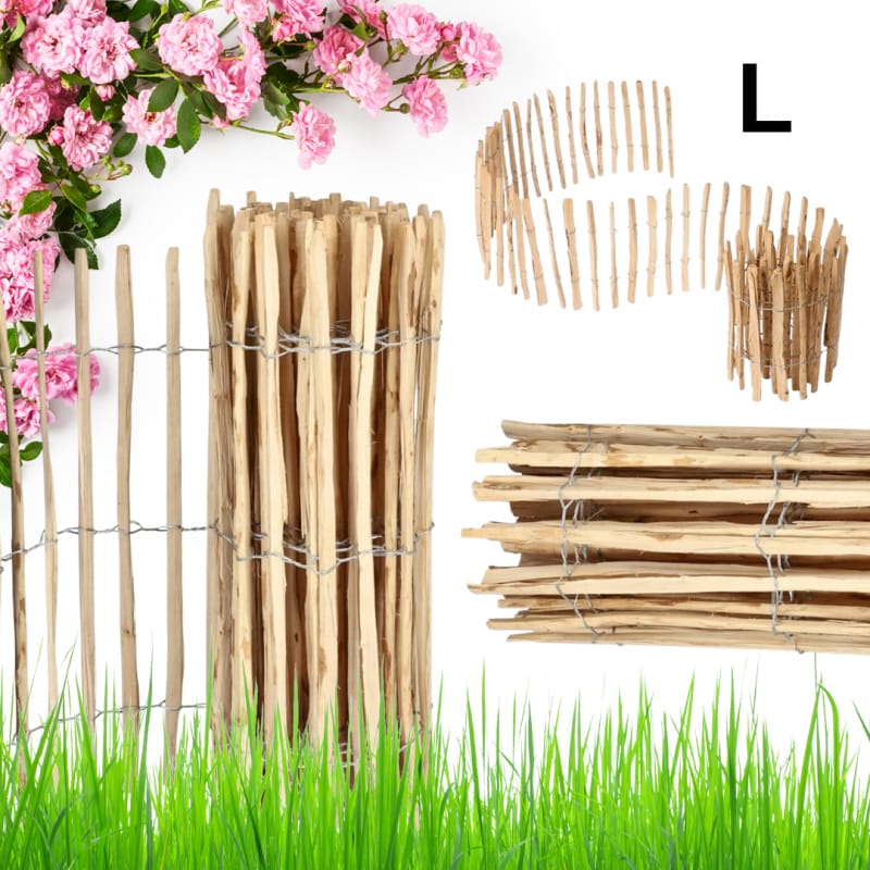PŁOTEK LESZCZYNOWY OGRODOWY- PALISADA ŁUPANKA Płotek do ogrodu wykonany z leszczynowych łupanych patyków, plecionych na drucie.Minimalistyczne ogrodzenie z naturalnego drewna i mocnych drutów.Płotek łatwo wbić w podłoże, jest wytrzymały i stabilny. DANE TECHNICZNE:Kolor: naturalne drewnoWysokość: 100cmDługość: 500cmOdległości między patykami: 4-5 cmWaga: 12,5 kg Materiał:Drewno leszczynowe Wymiary opakowania:100 x 40 x 40 cm