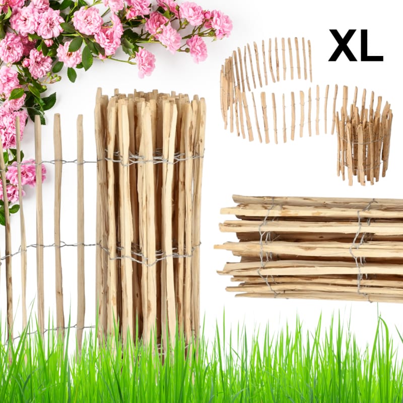 PŁOTEK LESZCZYNOWY OGRODOWY- PALISADA ŁUPANKA Płotek do ogrodu wykonany z leszczynowych łupanych patyków, plecionych na drucie.Minimalistyczne ogrodzenie z naturalnego drewna i mocnych drutów.Płotek łatwo wbić w podłoże, jest wytrzymały i stabilny. DANE TECHNICZNE:Kolor: naturalne drewnoWysokość: 120cmDługość: 500cmOdległości między patykami: 4-5 cmWaga: 14 kg Materiał:Drewno leszczynowe Wymiary opakowania:120 x 40 x 40cm