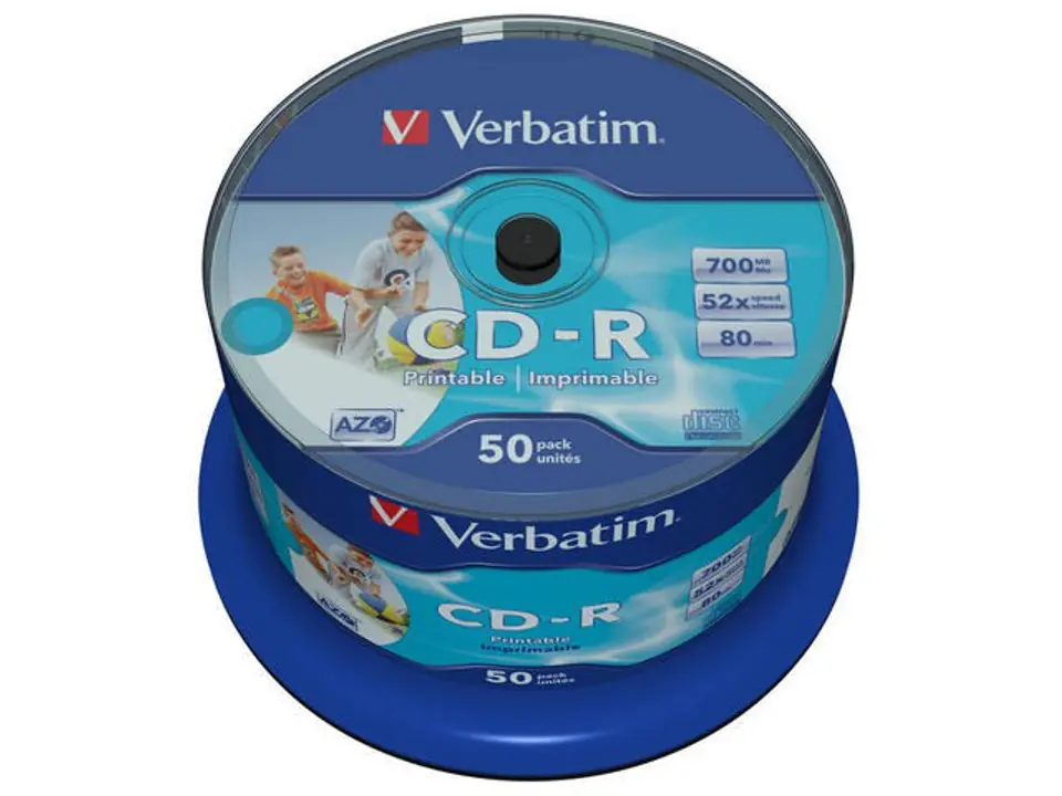 Dyski Verbatim CD-R 700 MB jednokrotnego zapisu korzystają i wyposażone są w warstwę nagrywalną AZO firmy Verbatim, która zapewnia bardzo dobrą jakość każdego nagrania. Wysoka zgodność dysków firmy Verbatim powoduje, że nadają się one do udostępniania danych komputerowych, filmów wideo, zdjęć czy muzyki. Specyfikacja mechaniczna nośnika firmy Verbatim jest bardzo precyzyjna, a zapisane na nim dane można odczytać w wielu napędach. Dlatego też dyski Verbatim zapewniają wysoki poziom zgodności z napędami działającymi z różnymi szybkościami. Płyty posiadają nową powierzchnie do nadruku dzięki, której kolory są żywe i głębokie. Dyski z powierzchnią do nadruku mogą także mieć błyszczące wykończenie. Podobnie jak w przypadku drukowania fotografii, można wybrać błyszczące lub matowe wykończenie. Płyty firmy Verbatim pozwalają zapisać dane z prędkością mieszczącą się w przedziale 1-52x. Długość zapisu to 80 minut co pozwoli na wygodne przechowywanie danych. W wygodnym opakowaniu typu Cake znajdziemy 50 płyt.
