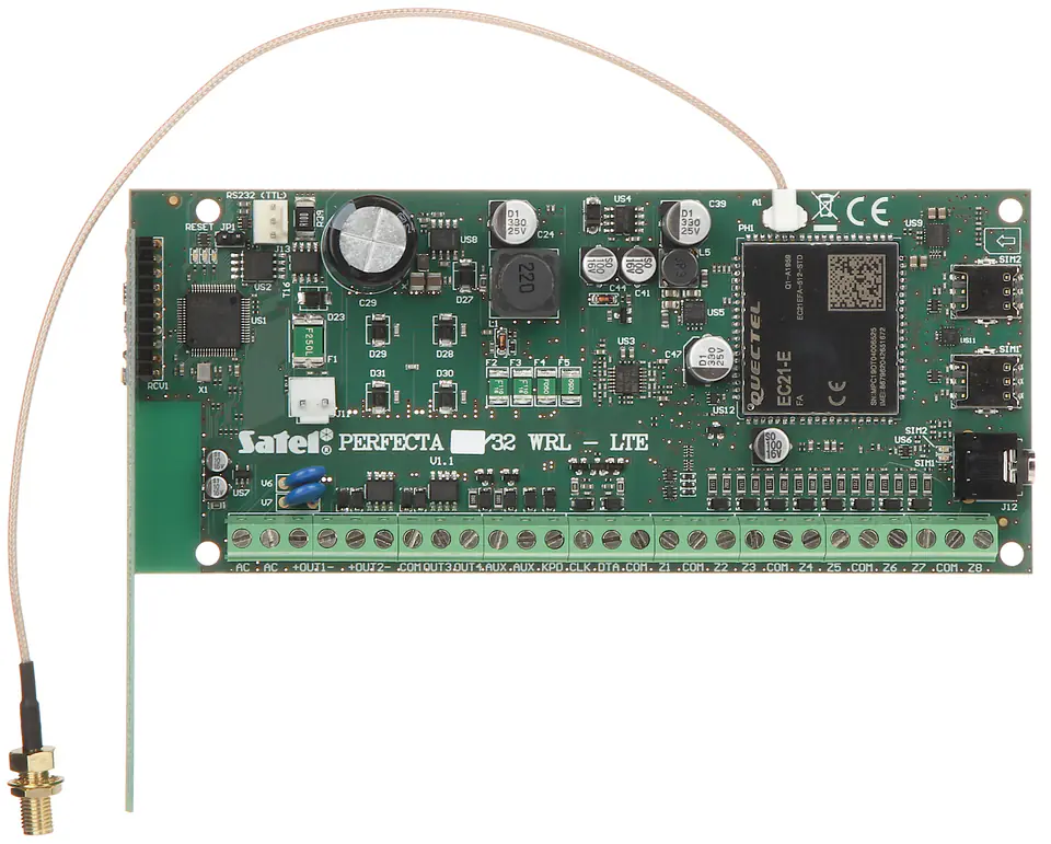 Wbudowany moduł telefonu komórkowego (obsługujący transmisję danych w technologii LTE / HSPA+ / EDGE / GPRS - w zależności od sieci komórkowej) daje szerokie możliwości: umożliwia współpracę z aplikacją mobilną, z obsługą wiadomości PUSH, zdalną konfigurację z użyciem programu PERFECTA Soft, monitoring zdarzeń (np. do stacji monitorującej agencji ochrony), powiadamianie głosowe, sterowanie przez SMS oraz weryfikację audio (nasłuch dźwięków z chronionego obiektu)Obsługiwane są dwie karty nano-SIM, co zapewnia ciągłość komunikacji: przy wystąpieniu problemów z zasięgiem pierwszego operatora, automatycznie wybierana jest druga karta