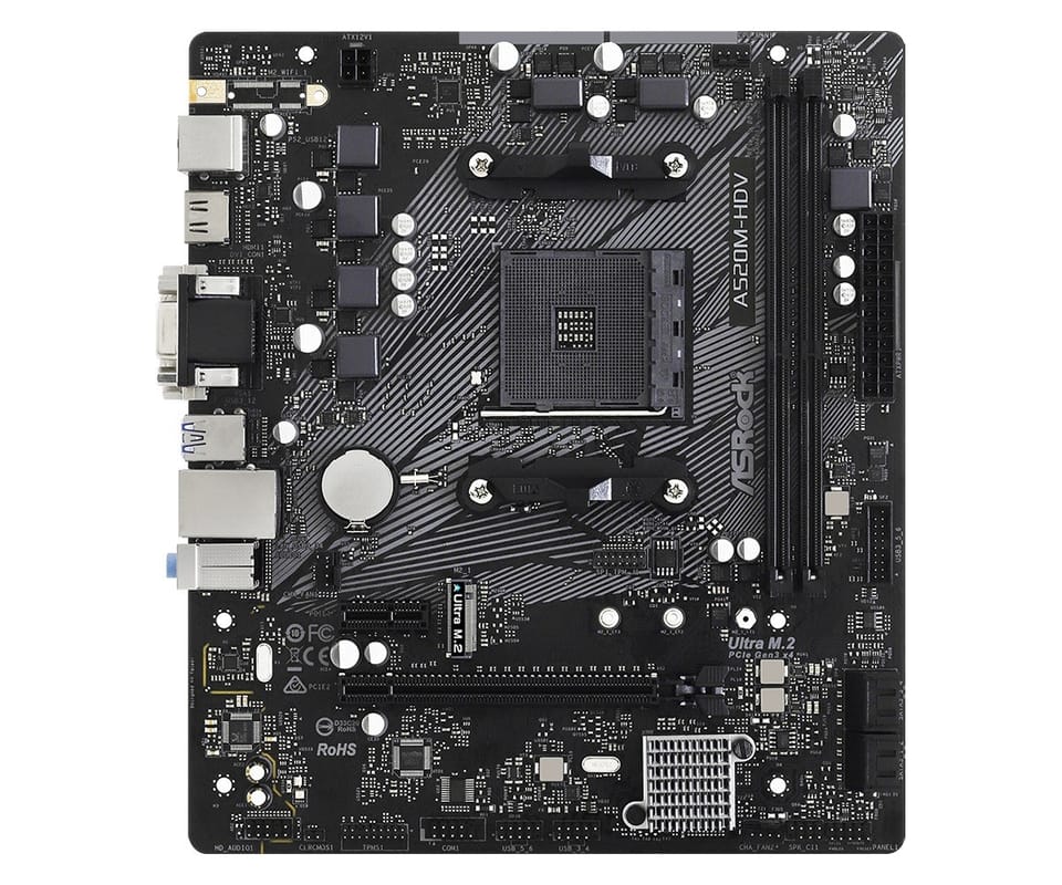 ASRock A520M-HDV Rodzina procesorów AMD, Gniazdo procesora AM4, DDR4 DIMM, Gniazda pamięci 2, Obsługiwane interfejsy dysków twardych SATA, M.2, Liczba złączy SATA 4, Chipset AMD A520, Micro ATX