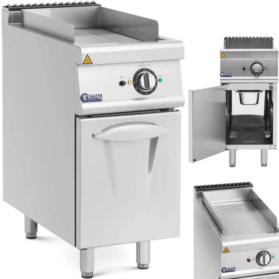 Kod producenta: 10013399Elektryczna płyta grillowa marki Royal Catering sprawdzi się w profesjonalnej gastronomii. Umożliwia serwowanie pożywnych specjałów z grilla przez cały rok. Grill zachwyca niską emisją dymu oraz higienicznym i bardzo czystym sposobem pracy. Urządzenie zachwyca funkcjonalnym designem i praktycznymi funkcjami. Wymiary grilla 80 x 73 cm oraz wysokość 90 cm pozwalają z łatwością zintegrować go z większością mebli kuchennych. Pod urządzeniem znajduje się pojemna szafka na garnki, patelnie i inne przybory kuchenne. Element grzewczy o mocy 5400 W pozwala bardzo szybko osiągnąć temperaturę roboczą od 50 do 300deg;C. Ustawiana jest ona za pomocą poręcznych pokręteł. Powierzchnia do smażenia wykonana jest ze stali chromowanej i szybko przenosi ciepło z grzałek do potrawy. Solidna płyta ma wymiary 33,5 x 55 cm i jest ryflowana. Osłona przeciwbryzgowa chroni grillowaną żywność przed wiatrem i utratą ciepła oraz zapobiegnie spadaniu jedzenia lub pryskaniu tłuszczu dookoła. Nóżki są regulowane w zakresie 3 cm i zapewnią urządzeniu stabilną pozycję nawet na nierównym podłożu. Obudowa grilla wykonana jest z wysokiej jakości stali nierdzewnej, dzięki czemu jest szczególnie odporna na korozję, neutralna w kontakcie z żywnością i łatwa w czyszczeniu. Płyta grillowa posiada wyjmowaną tackę na tłuszcz wytopiony podczas smażenia. Specjalny ociekacz sprawia, że spływa on bardzo swobodnie. Tackę ociekową GN 1/3 (17,5 x 32,5 x 9,5 cm) łatwo można wyjąć i wyczyścić.Cechy produktu: