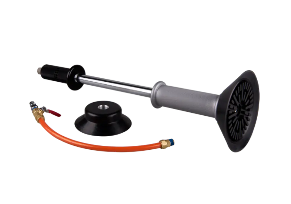 Młotek pneumatyczny na podciśnienie z 2 głowicami do wyciągania wgnieceń bez konieczności lakierowania ( technologia PDR ) .W zestawie:- Młotek bezwładnościowy (waga: 1,36 kg) - 2 gumowe przyssawki o średnicach 120 i 150 mm - Wężyk dla wygodnej pracy dł. 330 mm - Złączka mosiężna 1/4" Karta produktu - 9CH212