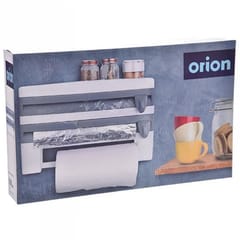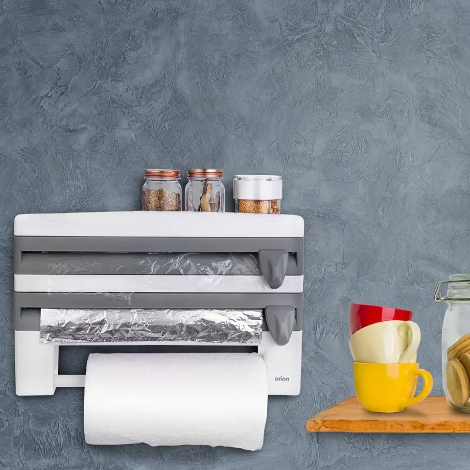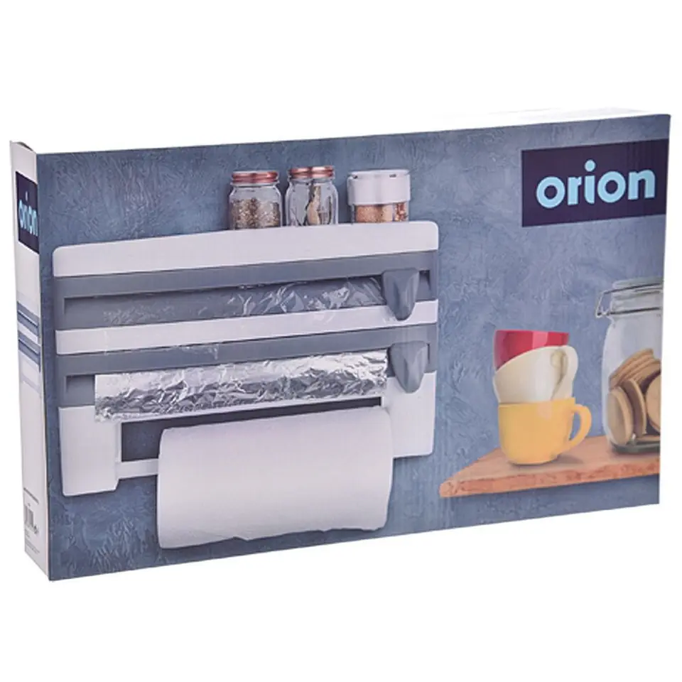Podajnik do folii i ręczników papierowych do montażu na ścianie. Wygodny w użytkowaniu. Dyspenser pomaga w łatwy sposób wyjmować potrzebną ilość folii spożywczej i folii aluminiowej. Ostrza z uchwytami zapewniają bezpieczne przycinanie potrzebnej ilości folii. Wyposażony w wieszak na ręczniki papierowe. Posiada dodatkową półkę w górnej części, na której można przechowywać papier do pieczenia, małe pojemniki z przyprawami, bądź drobne akcesoria kuchenne (np. minutnik). Przydatny w każdej kuchni, również profesjonalnej. Oryginalny produkt czeskiej marki Orion. Wyprodukowano zgodnie z europejskimi standardami.