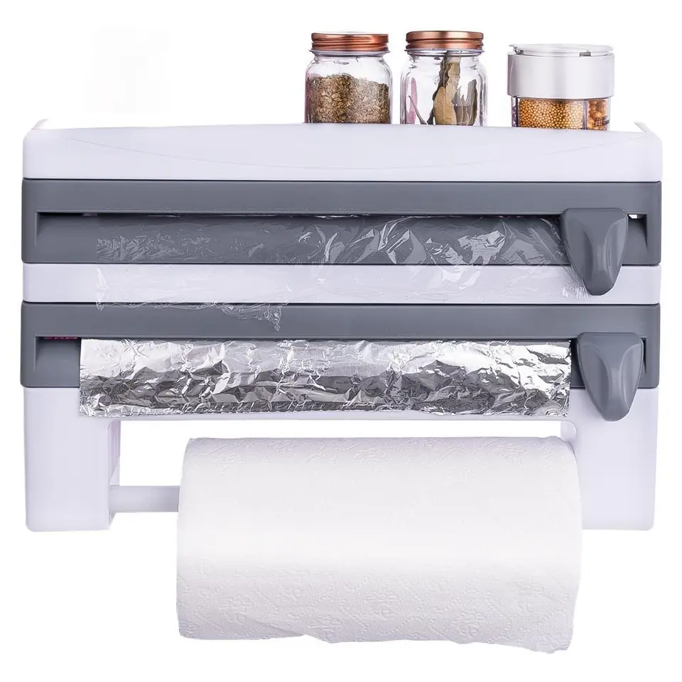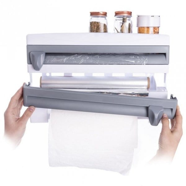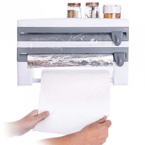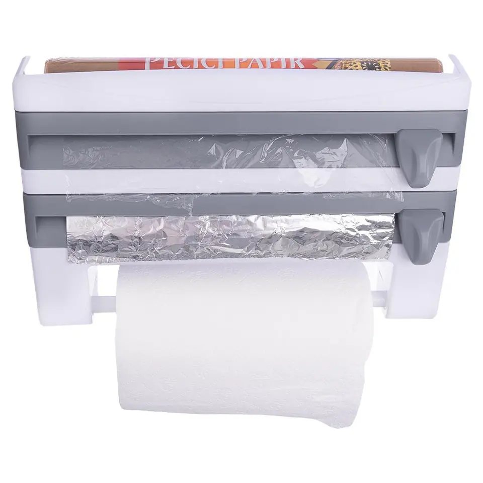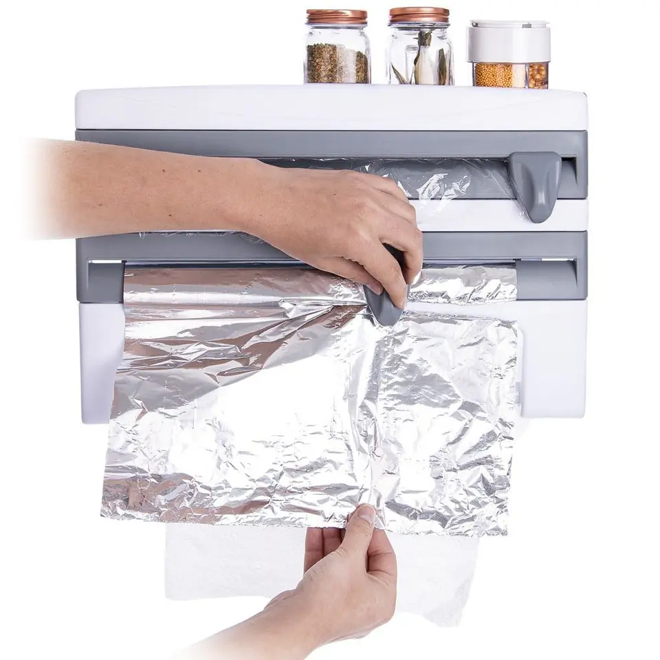 Podajnik do folii spożywczej, aluminiowej oraz ręczników papierowych. Górna część może być wykorzystana jako półka na przyprawy, papier do pieczenia itp. Wyposażona w 2 ostrza do przecinania folii.
