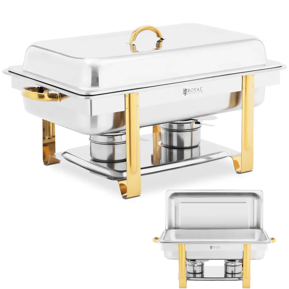 Podgrzewacz do potraw marki Royal Catering przyda się w hotelu, restauracji czy podczas imprezy z cateringiem do utrzymywania w cieple potraw. Wykonany został ze stali nierdzewnej neutralnej dla żywności. Elegancki wygląd i odpowiedni rozmiar przyciągają wzrok i wzbudzają zainteresowanie gości pyszną zawartością. Za sprawą pojemności 9 l obsłużysz wielu gości jednocześnie. Wygodnie wyjmowany pojemnik GN 1/1 ułatwia napełnianie świeżo przygotowanej zupy, sosu, chili con carne lub gulaszu bezpośrednio na kuchence. Podgrzewacz do potraw wykonany został z wytrzymałej i odpornej na zarysowania stali nierdzewnej i spełnia wysokie wymagania higieniczne branży gastronomicznej. Posiada również praktyczne uchwyty do przenoszenia. Pokrywę łatwo zdjąć, aby nałożyć jedzenie. Bemar jest nieskomplikowany i elastyczny w użyciu, ponieważ nie wymaga podłączenia do zasilania. Pojemniki na paliwo są łatwo dostępne. Wystarczy napełnić je specjalną pastą. Palniki posiadają pokrywki ułatwiające zgaszenie płomienia i zapewniające bezpieczeństwo podczas użytkowania podgrzewacza jedzenia. Pastę paliwową umieszcza się centralnie i bezpiecznie pod dnem zbiornika na wodę (505 x 303 x 100 mm). Selektywne i oszczędne podgrzewanie cienkościennego pojemnika gwarantuje optymalną dystrybucję ciepła. Dzięki temu potrawy są gotowe do spożycia przez wiele godzin. Woda służy również jako idealny bufor, aby jedzenie się nie przypaliło ani nie rozgotowało. Kolejną zaletą kąpieli wodnej jest fakt, że nawet po zgaśnięciu płomienia, gorąca woda utrzymuje przez pewien czas ciepło potrawy. Po użyciu całe urządzenie jest łatwe w demontażu, czyszczeniu i przechowywaniu.