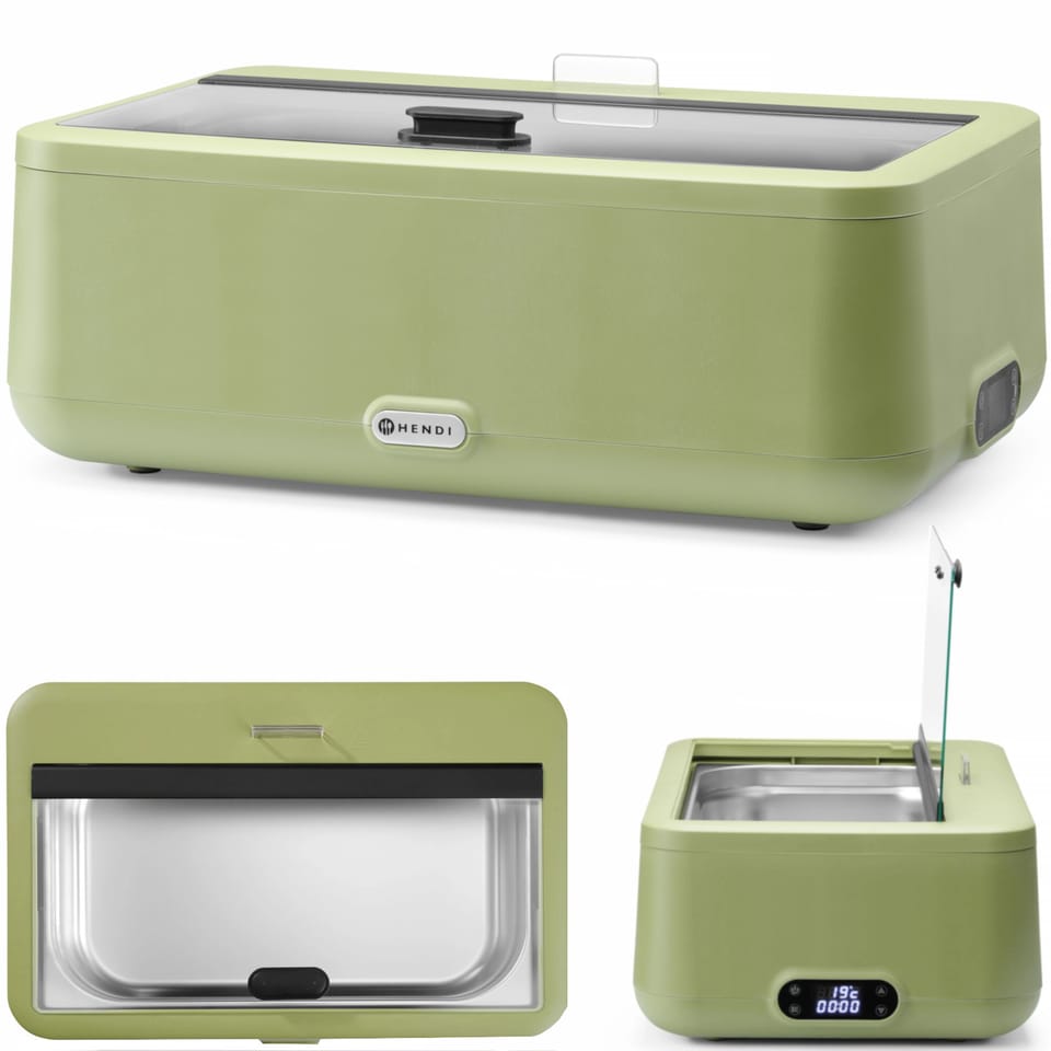 Kod producenta: 470435Podgrzewacz elektryczny HENDI UNIQ został zaprojektowany przez renomowanego holenderskiego projektanta Roberta Bronwassera i jest dostępny w 3 stylowych kolorach. Urządzenie ma nowoczesną obudowę i wyróżnia się kilkoma niezwykłymi funkcjami. Wystarczy podłączyć, napełnić pojemnik wodą, a podgrzewacz utrzyma zapiekanki, mięsa, gotowane warzywa, makarony, sosy i inne potrawy w stałej, idealnej temperaturze serwowania. Obudowa została wykonana z polipropylenu odpornego na wysoką temperaturę. Demontowany wkład GN 1/1 o wysokości (H)100mm wykonany ze stali nierdzewnej AISI 304 jest łatwy w czyszczeniu. Grzałka wykonana została ze stali nierdzewnej AISI 304, umieszczona jest we wkładzie na wodę dla wydajnego transferu ciepła. Pokrywa wykonana ze szkła hartowanego wyposażona jest w izolowany uchwyt, posiada wycięcie na chochlę oraz aluminiowy zawias. Specjalna dwuczęściowa konstrukcja pokrywy redukuje utratę ciepła przy otwieraniu, równocześnie zachowując optymalną higienę pracy. Na pokrywie umieszczony jest uchwyt (holder) na etykietę z nazwą dania. Elektroniczny panel sterowania wyświetla czas pracy, temperaturę zadaną oraz aktualnie ustawioną temperaturę. Ostatnie ustawienie temperatury jest zapisywane w pamięci i zostaje automatycznie wybrane przy włączeniu urządzenia. Bemar nie jest przeznaczony do gotowania, służy jedynie do utrzymywania ciepła.Cechy produktu: