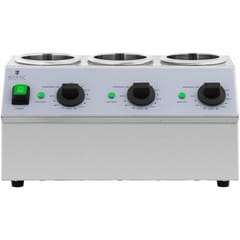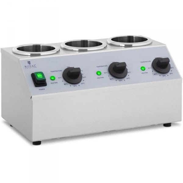 Podgrzewacz do sosów marki Royal Catering pozwala utrzymać w cieple sosy w butelkach. Bez względu na to, czy są to sosy serowe, chilli, barbecue, do nachosów lub kiełbasek, a także polewy czekoladowe - zawsze mają odpowiednią temperaturę. Urządzenie przeznaczone zostało do 3 butelek 1 l o średnicy 93 mm. Moc podgrzewacza wynosi 550 W. Urządzenie szybko osiąga żądaną temperaturę. Panel sterowania na górze jest bardzo dobrze rozplanowany i zawsze zapewnia maksymalną kontrolę podczas podgrzewania sosów. Każda komora na butelkę ma możliwość regulacji temperatury. Dzięki temu w różnym stopniu podgrzejesz trzy sosy jednocześnie. Obudowę wykonano z łatwej w pielęgnacji stali nierdzewnej. Gładkie powierzchnie są łatwe do czyszczenia. Cztery gumowe nóżki zapewniają bezpieczną podstawę.