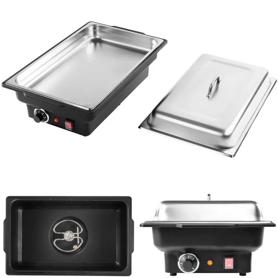 Nazwa producenta: Royal Catering RCCD-1/1-100-KS-E Profesjonalny podgrzewacz, bemar stołowy do potraw niemieckiego producenta urządzeń dla gastronomii Royal Catering. Podgrzewanie potraw odbywa się w pojemniku o rozmiarach GN 1/1, który jest zanurzony w kąpieli wodnej. Regulację temperatury w zakresie od 30 do 90deg;C zapewnia grzałka o mocy 900 W i umożliwia precyzyjne dostosowanie ciepła do rodzaju potrawy. Pojemnik GN 1/1, który znajduje się w zestawie, został wykonany z wysokojakościowej stali szlachetnej, dzięki czemu jest odporny na korozję oraz uszkodzenia mechaniczne. Pojemność pojemnika wynosi 13 l, a wysokość 100 mm. Pojemnik GN nadaje się do użytkowania w piecach i lodówkach. Wanna na wodę wykonana jest z wytrzymałego tworzywa sztucznego, odpornego na działanie wysokich temperatur. Woda, znajdująca się w pojemniku, paruje i ogrzewa (od spodu) pojemnik GN. Na ściance wanny znajduje się wskaźnik poziomu wody od 2 do 3 litrów. Panel sterowania składa się z lampki kontrolnej, włącznika/wyłącznika oraz wygodnego pokrętła do ustawiania temperatury na 5 poziomach. Oferowany podgrzewacz do potraw charakteryzuje się intuicyjną obsługą oraz ergonomiczną konstrukcją.Parametry techniczne: